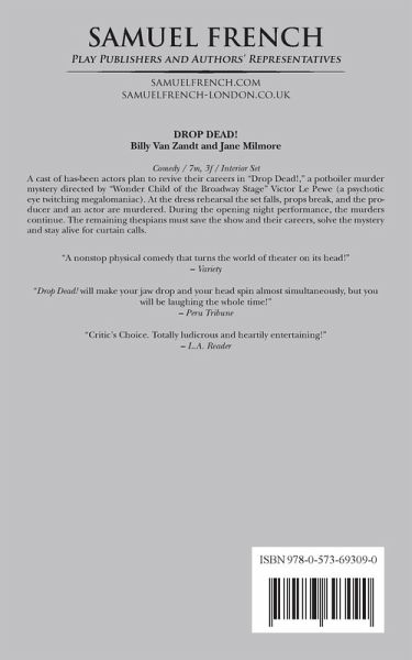 Comedy / Characters: 7 male, 3 female Scenery: Interior A cast of has been actors plan to revive their careers in Drop Dead!, a potboiler murder mystery directed by "Wonder Child of the Broadway Stage" Victor Le Pewe (a psychotic eye twitching megalomaniac). At the dress rehearsal the set falls, props break, and the producer and an actor are murdered. During the opening night performance, the murders continue. The remaining thespians must save the show and their careers, solve the mystery