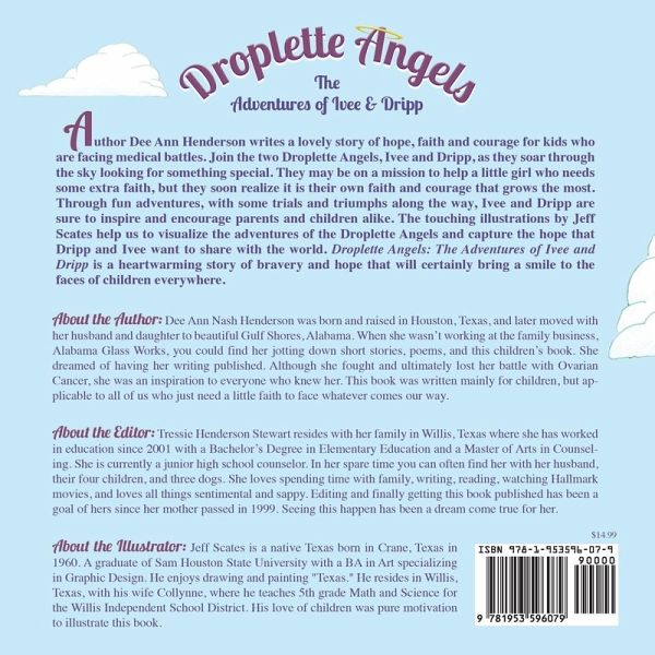 Author Dee Ann Henderson writes a lovely story of hope, faith and courage for kids who are facing medical battles. Join the two Droplette Angels, Ivee and Dripp, as they soar through the sky looking for something special. They may be on a mission to help a little girl who needs some extra faith, but they soon realize it is their own faith and courage that grows the most. Through fun adventures, with some trials and triumphs along the way, Ivee and Dripp are sure to inspire and encourage parents and children alike. The touching illustrations by Jeff Scates help us to visualize the adventures of the Droplette Angels and capture the hope that Dripp and Ivee want to share with the world. Droplette Angels: The Adventures of Ivee and Dripp is a heartwarming story of bravery and hope that will certainly bring a smile to the faces of children everywhere.