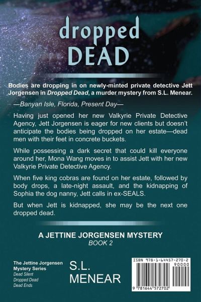 Bodies are dropping in on newly-minted private detective Jett Jorgensen in Dropped Dead, a murder mystery from S.L. Menear. -Banyan Isle, Florida, Present Day- Having just opened her new Valkyrie Private Detective Agency, Jett Jorgensen is eager for new clients but doesn't anticipate the bodies being dropped on her estate-dead men with their feet in concrete buckets. While possessing a dark secret that could kill everyone around her, Mona Wang moves in to assist Jett with her new Valkyrie Private Detective Agency. When five king cobras are found on her estate, followed by body drops, a late-night assault, and the kidnapping of Sophia the dog nanny, Jett calls in ex-SEALS. But when Jett is kidnapped, she may be the next one dropped dead. Publisher's Note: Dropped Dead is the second in a series of suspenseful mysteries with a baffling series of crimes that lead three female sleuths to surprising discoveries and shocking resolutions. Readers who enjoy clean and wholesome entertainment with a touch of humor, romance, and paranormal will not want to miss this exciting series. The Jettine Jorgensen Mystery Series Dead Silent Dropped Dead Dead Ends