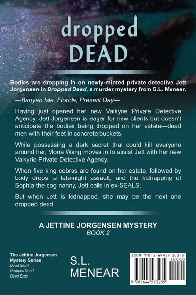Bodies are dropping in on newly-minted private detective Jett Jorgensen in Dropped Dead, a murder mystery from S.L. Menear. -Banyan Isle, Florida, Present Day- Having just opened her new Valkyrie Private Detective Agency, Jett Jorgensen is eager for new clients but doesn't anticipate the bodies being dropped on her estate-dead men with their feet in concrete buckets. While possessing a dark secret that could kill everyone around her, Mona Wang moves in to assist Jett with her new Valkyrie Private Detective Agency. When five king cobras are found on her estate, followed by body drops, a late-night assault, and the kidnapping of Sophia the dog nanny, Jett calls in ex-SEALS. But when Jett is kidnapped, she may be the next one dropped dead. Publisher's Note: Dropped Dead is the second in a series of suspenseful mysteries with a baffling series of crimes that lead three female sleuths to surprising discoveries and shocking resolutions. Readers who enjoy clean and wholesome entertainment with a touch of humor, romance, and paranormal will not want to miss this exciting series. The Jettine Jorgensen Mystery Series Dead Silent Dropped Dead Dead Ends