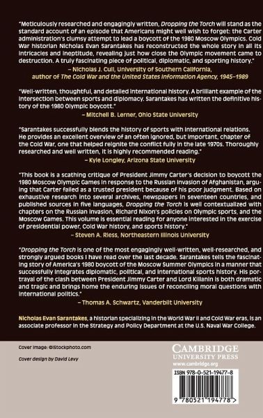 Dropping the Torch: Jimmy Carter, the Olympic Boycott, and the Cold War offers a diplomatic history of the 1980 Olympic boycott. Broad in its focus, it looks at events in Washington, D.C., as well as the opposition to the boycott and how this attempted embargo affected the athletic contests in Moscow. Jimmy Carter based his foreign policy on assumptions that had fundamental flaws and reflected a superficial familiarity with the Olympic movement. These basic mistakes led to a campaign that failed to meet its basic mission objectives but did manage to insult the Soviets just enough to destroy détente and restart the Cold War. The book also includes a military history of the Soviet invasion of Afghanistan, which provoked the boycott, and an examination of the boycott's impact four years later at the Los Angeles Olympics, where the Soviet Union retaliated with its own boycott.