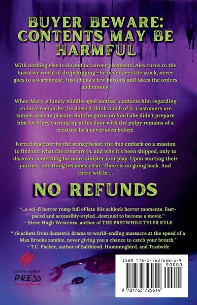 BUYER BEWARE: CONTENTS MAY BE HARMFUL With nothing else to do and no career prospects, Alex turns to the lucrative world of dropshipping-he never sees the stock, never goes to a warehouse. Just clicks a few buttons and takes the orders and money.When Mary, a lonely middle-aged mother, contacts him regarding an incorrect order, he doesn't think much of it. Customers are simple, easy to placate. But the gurus on YouTube didn't prepare him for Mary turning up at his door with the pulpy remains of a creature he's never seen before.Forced together by the stinky beast, the duo embark on a mission to find out what the creature is, and why it's been shipped, only to discover something far more sinister is at play. Upon starting their journey, one thing becomes clear. There is no going back. And there will be...NO REFUNDS