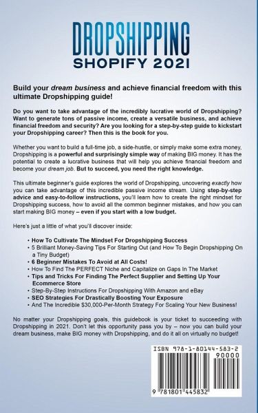 Build your dream business and achieve financial freedom with this ultimate Dropshipping guide! Do you want to take advantage of the incredibly lucrative world of Dropshipping? Want to generate tons of passive income, create a versatile business, and achieve financial freedom and security? Are you looking for a step-by-step guide to kickstart your Dropshipping career? Then this is the book for you. Whether you want to build a full-time job, a side-hustle, or simply make some extra money, Dropshipping is a powerful and surprisingly simple way of making BIG money. It has the potential to create a lucrative business that will help you achieve financial freedom and become your dream job. But to succeed, you need the right knowledge. This ultimate beginner's guide explores the world of Dropshipping, uncovering exactly how you can take advantage of this incredible passive income stream. Using step-by-step advice and easy-to-follow instructions, you'll learn how to create the right mindset for Dropshipping success, how to avoid all the common beginner mistakes, and how you can start making BIG money - even if you start with a low budget. Here's just a little of what you'll discover inside: How To Cultivate The Mindset For Dropshipping Success 5 Brilliant Money-Saving Tips For Starting Out (and How To Begin Dropshipping On a Tiny Budget) 6 Beginner Mistakes To Avoid at All Costs! How To Find The PERFECT Niche and Capitalize on Gaps In The Market Tips and Tricks For Finding The Perfect Supplier and Setting Up Your Ecommerce Store Step-By-Step Instructions For Dropshipping With Amazon and eBay SEO Strategies For Drastically Boosting Your Exposure And The Incredible $30,000-Per-Month Strategy For Scaling Your New Business! No matter your Dropshipping goals, this guidebook is your ticket to succeeding with Dropshipping in 2021. Don't let this opportunity pass you by - now you can build your dream business, make BIG money with Dropshipping, and do it all on virtually no budget! Buy now to start your dream Dropshipping business today!