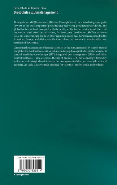 Drosophila suzukii (Matsumura) (Diptera: Drosophilidae), the spotted wing drosophila (SWD), is the most important pest affecting berry crop production worldwide. The global fresh fruit trade, coupled with the ability of the larvae to hide inside the fruit undetected until after transportation, facilitate their distribution. SWD is native to Asia, but is increasingly found in other regions: occurrences have been recorded in the Americas and Europe, and Africa, and the insects have the potential to adapt and become established in Oceania. Gathering the experiences of leading scientists in the management of D. suzukii around the globe, the book addresses D. suzukii monitoring; biological, chemical and cultural control; sterile insect technique (SIT); integrated pest management (IPM), and other control methods. It also discusses the use of drones, GPS, biotechnology, telemetry and other technological tools to make the management of this pest more efficient and accurate. As such, it is a valuable resource for scientists, professionals and students.