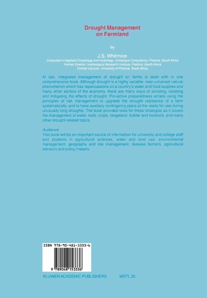 At last, integrated management of drought on farms is dealt with in one comprehensive book. Although drought is a highly variable, near-universal natural phenomenon which has repercussions on a country's water and food supplies and many other sectors of the economy, there are many ways of avoiding, resisting and mitigating the effects of drought. Pro-active preparedness entails using the principles of risk management to upgrade the drought resistance of a farm systematically, and to have auxiliary contingency plans at the ready for use during unusually long droughts. The book provides tools for these strategies as it covers the management of water, soils, crops, rangeland, fodder and livestock, and many other drought-related topics.