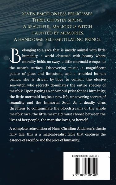 Seven emotionless princesses. Three ghostly sirens. A beautiful, malicious witch haunted by memories. A handsome, self-mutilating prince. Belonging to a race that is mostly animal with little humanity, a world obsessed with beauty where morality holds no sway, a little mermaid escapes to the ocean’s surface. Discovering music, a magnificent palace of glass and limestone, and a troubled human prince, she is driven by love to consult the elusive sea-witch who secretly dominates the entire species of merfolk. Upon paying an enormous price for her humanity, the little mermaid begins a new life, uncovering secrets of sexuality and the Immortal Soul. As a deadly virus threatens to contaminate the bloodstreams of the whole merfolk race, the little mermaid must choose between the lives of her people, the man she loves, or herself. A complete reinvention of Hans Christian Andersen's classic fairy tale, this is a magical-realist fable that captures the essence of sacrifice and the price of humanity.