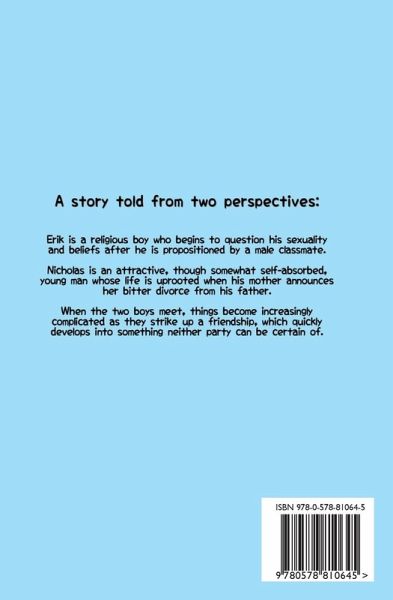 A story told from two perspectives: Erik is a religious boy who begins to question his sexuality and beliefs after he is propositioned by a male classmate. Nicholas is an attractive, though somewhat self-absorbed, young man whose life is uprooted when his mother announces her bitter divorce from his father. When the two boys meet, things become increasingly complicated as they strike up a friendship, which quickly develops into something neither party can be certain of.