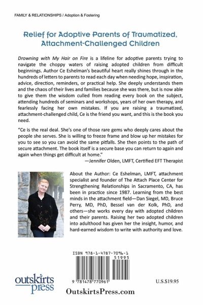 Relief for Adoptive Parents of Traumatized, Attachment-Challenged Children. . . Drowning with My Hair on Fire is a lifeline for adoptive parents trying to navigate the choppy waters of raising adopted children from difficult beginnings. Author Ce Eshelman's beautiful heart really shines through in the hundreds of letters to parents to read each day when needing hope, inspiration, advice, direction, reminders, or practical help. She deeply understands them and the chaos of their lives and families because she was there, but is now able to give them the wisdom culled from reading every book on the subject, attending hundreds of seminars and workshops, years of her own therapy, and fearlessly facing her own mistakes. If you are raising a traumatized, attachment-challenged child, Ce is the friend you want, and this is the book you need. "Ce is the real deal. She's one of those rare gems who deeply cares about the people she serves. She is willing to freeze frame and blow up her mistakes for you to see so you can avoid the same pitfalls. She then points to the path of secure attachment. The book itself is a secure base you can return to again and again when things get difficult at home." -Jennifer Olden, LMFT, Certified EFT Therapist