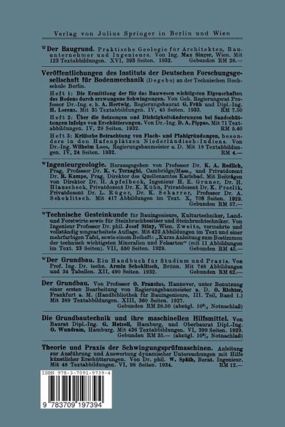 I. Einleitung.- 1. Problemstellung und Begrenzung des Stoffes.- 2. Der Begriff "Baugrund".- 3. Die plastischen Erscheinungen in erdartigen Körpern.- II. Messungen von Spannungen und Formänderungen in erdartigen Körpern.- 4. Einteilung der Versuche.- 5. Allgemeine Messungsergebnisse der unter 4. genannten Versuche.- III. Spannungen und Formänderungen im elastisch-isotropen Halbraum.- 6. Allgemeines.- 7. Spannungen im elastisch-isotropen Halbraume, hervorgerufen durch eine lotrechte Einzellast.- 8. Elastische Verschiebungen eines Punktes im elastisch-isotropen Halbraume infolge einer lotrechten Einzellast.- IV. Statisch mögliche, elementare SpannungsVerteilungen im Halbraum nach dem Prinzipe der geradlinigen Kraftausbreitung.- 9. Allgemeines.- 10. Die elementare Spannungsverteilung infolge einer lotrechten Einzellast P.- 11. Die elementare Spannungsverteilung infolge einer lotrechten Linienlast q?.- 12. Die elementare Spannungsverteilung infolge einer waagrechten Einzellast Pw.- 13. Die elementare Spannungs Verteilung infolge einer waagrechten Linienlast q?w.- V. Verlauf charakteristischer Spannungen im Halbraum nach dem Prinzipe der geradlinigen Kraftausbreitung.- 14. Die Spannungen in ausgezeichneten Flächen bzw. Linien. Geometrische Ort er gleicher Spannungen.- 15. Lotrechte Einzellast P.- 16. Lotrechte Linienlast q?.- VI. Der Spannungszustand im Halbraum infolge Belastung eines Teiles der Oberfläche, nach dem Prinzipe der geradlinigen Kraftausbreitung.- A. Der unendlich lange Last streifen.- B. Die kreisförmige Lastfläche.- VII. Der Einfluß von Schubspannungen, die in der Oberfläche des Halbraumes wirken, auf den Verlauf der lotrechten Normalspannungen.- 23. Zentrisch-symmetrisches, waagrechtes Kraftsystem in der Oberfläche des elastisch-isotropenHalbraumes.- 24. Parallele waagrechte Schubkräfte in der Oberfläche des elastisch-isotropen Halbraumes.- 25. Sohlreibung bei streifenförmiger Lastfläche.- 26. Sohlreibung bei kreisförmiger Lastfläche.- VIII. Gleichgewichtsstörungen in kohäsionslosen und bindigen Böden.- 27. Fließbedingung für verschiedene Bodenarten.- 28. Brucherscheinungen in Erdprismen.- IX. Die Grenzflächen zwischen dem elastischen und plastischen Gebiet des örtlich belasteten Halbraumes.- 29. Lotrechte Einzellast P.- 30. Lotrechte Linienlast q?.- 31. Die gleichmäßige Streifenbelastung.- 32. Die gleichmäßig belastete Kreisfläche.- X. Der Beginn des Fließvorganges.- 33. Die kritische Randbelastung.- XI. Das elastische Verhalten der Böden.- 34. Der mit der Tiefe zunehmende Elastizitätsmodul.- 35. Einfluß des elastischen Verhaltens einer Bodenart auf die Ordnungszahl der Spannungsverteilung.- 36. Elastische Senkungen in besonderen Belastungsfällen.- XII. Einfluß der plastischen Erscheinungen auf die Setzung einer Lastfläche.- 37. Die Diskontinuität im plastischen Gebiet.- 38. Die plastische Setzung der streifenförmigen Lastfläche.- 39. Die plastische Setzung der kreisförmigen Lastfläche.- 40. Einfluß der plastischen Erscheinungen auf die Setzung einer kreisförmigen Lastfläche mit veränderlichem Durchmesser bei konstantem Sohldruck.- XIII. Überprüfung der Folgerungen aus dem Prinzipe der geradlinigen Kraftausbreitung durch Vergleich mit Versuchsergebnissen.- 41. Die Versuche der Reihe "Steiner-Kick".- 42. Die Versuche der Reihe "Eöppl".- 43. Versuche der Reihe "Probebelastungen".- XIV. Die kritische Randbelastung als Anhaltspunkt für die zulässige Belastung des Baugrundes.- 44. Tragfähigkeit (Grenzbelastung) und Proportionalitätsgrenze.- 45.Nachrechnung ausgeführter Gründungen auf kohäsionslosen Böden.- XV. Einfluß der Schichtung des Baugrundes und des Grundwasserstandes auf die Setzung und die Wahl der zulässigen Bodenpressung.- 46. Berücksichtigung der Schichtung des Baugrundes.- 47. Berücksichtigung des Grundwasserstandes.- XVI. Plastische Erscheinungen bei verschiedenen Aufgaben der Grundbaustatik.- 48. Die Fließgebiete in der Nähe eines Einschnittes mit senkrechten Böschungen.- 49. Der Druck auf nachgiebige Bodenklappen.- 50. Die Fließerscheinungen in einem dickwandigen Rohr aus plastischem Ton bei Innen- bzw. Außendruck.- Schrifttumverzeichnis.