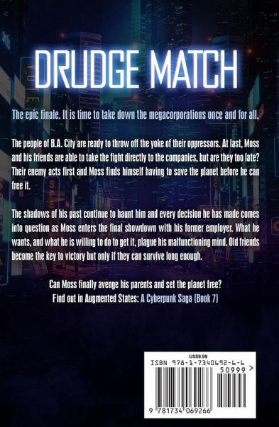 The epic finale. It is time to take down the megacorporations once and for all. The people of B.A. City are ready to throw off the yoke of their oppressors. At last, Moss and his friends are able to take the fight directly to the companies, but are they too late? Their enemy acts first and Moss finds himself having to save the planet before he can free it. The shadows of his past continue to haunt him and every decision he has made comes into question as Moss enters the final showdown with his former employer. What he wants, and what he is willing to do to get it, plague his malfunctioning mind. Old friends become the key to victory but only if they can survive long enough. Can Moss finally avenge his parents and set the planet free? Find out in Drudge Match: A Cyberpunk Saga (Book 7)!