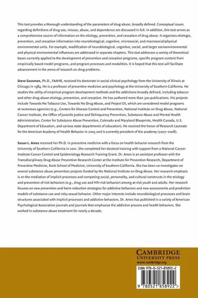 Preface Part I. Concepts and Classes of Drugs: 1. Concepts of drug, drug use, misuse, and abuse 2. Further classifications relevant to substance abuse and dependence 3. Types of drugs, history of drug use and misuse, and costs of drug misuse Part II. Etiology: 4, Current multivariable models 5. Neurobiologically relevant 6. Cognitive processes 7. Social interaction and social groups 8. The large physical and social environment 9. Assessment Part III. Prevention: 10. Concepts of prevention 11. Neurobiologically relevant 12. Cognitive processes 13. Social interaction and social groups 14. The large social and physical environment Part IV. Cessation: 15. Concepts of cessation 16. Neurobiologically relevant 17. Cognitive processes 18. Social interaction and social groups 19. The large social and physical environment Part V. Conclusions and the Future: 20. Conclusions, recent, and future directions.