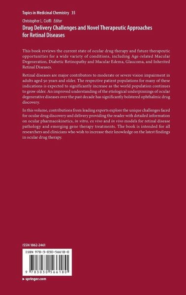 This book reviews the current state of ocular drug therapy and future therapeutic opportunities for a wide variety of conditions, including Age-related Macular Degeneration, Diabetic Retinopathy and Macular Edema, Glaucoma, and Inherited Retinal Diseases. Retinal diseases are major contributors to moderate or severe vision impairment in adults aged 50 years and older. The respective patient populations for many of these indications is expected to significantly increase as the world population continues to grow older. An improved understanding of the etiological underpinnings of ocular…mehr