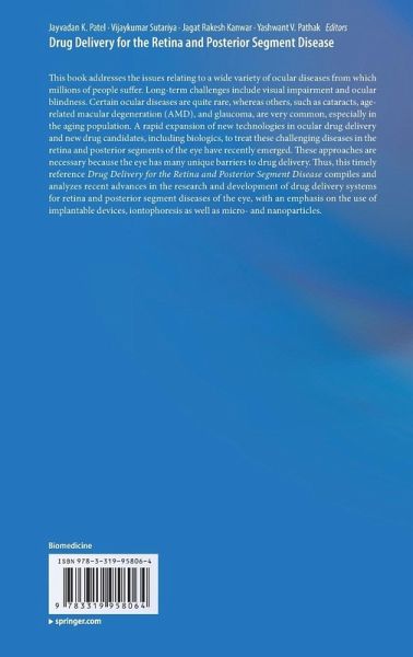 Part I- Introduction and basic concept of drug delivery for retina and posterior segment disease.- Anatomy and physiology of retina and posterior segment of the eye .- Pharmacotherapy of diabetic macular edema and retinopathy.- Drug delivery to posterior segment of eye: Conventional delivery strategies, their barriers and restrictions.- Penetration routes to retina and posterior segment.- Diabetic Retinopathy: Pathogenesis, Treatment, and Complications.- PART II-Nanotechnology based formulations for retina and posterior segment disease.- Liposomes for retina and posterior segment disease.- Nano/microparticles for retina and posterior segment disease.- Non-viral delivery systems for gene therapy for retina and posterior segment disease.- Oxidative stress in ocular disorders: Exploring the link to pesticide exposure and potential for using nanotechnology for antioxidant delivery.- Advances in the microbial infection in cornea and role of nanotechnology to cure ocular surface .- Nanomedicine based delivery to the posterior segment of eye: Brighter tomorrow.- Part III-Transscleral iontophoresis for retina and posterior segment disease.- Transscleral drug delivery to retina and posterior segment disease.- Colloidal carrier systems transscleral drug delivery.- Transscleral Iontophoretic Drug Delivery for Treating Retinal Diseases.- Part IV-Implant formulation for posterior eye segment.- Biodegradable polymeric implants for retina and posterior segment disease.- Nanomedicine based gene delivery for the retina and posterior segment diseases.- Part V-Prodrug strategies for retina and posterior segment disease.- Transporter targeted Pro-drug approach for retina and posterior segment disease.- Lipid Prodrug based delivery for retina and posterior segment disease.- Injectable Pro-drugs approach for retina and posterior segment disease .- Stereoisomeric dipeptide Pro-drug approach for retina and posterior segment disease.- Part VI-Other advances for retina and posterior segment diseases.- Receptor targeted Pro-drug approach for retina and posterior segment disease.- Intravitreal injection drug delivery for retina and posterior segment disease: Challenges and Future ahead.- Thermoresponsive gels drug delivery for retina and posterior segment disease.- Peptide synthesis and delivery for retina and posterior segment disease.- Corneal haze, refractive surgery and its implications on choroidal neovascularisation.