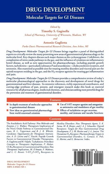 The application of molecular techniques to gastroenterology continues to yield important advances in the development of drugs to treat gastrointestinal disorders. Important new drugs have emerged through the collaborative and complementary efforts of basic scientists, clinicians, and clinical researchers in academia and the pharmaceutical industry. The challenge has been exciting, with a few surprises along the way. Consider peptic ulcer disease as an example. The discovery of H receptors and the availability of potent and 2 selective H-receptor antagonists signaled the beginning of a new era 2 in the treatment of gastric hypersecretory states and peptic ulcers. Introduction of proton pump inhibitors offered another therapeutic option. Though H-receptor antagonists and proton pump inhibitors 2 are important and useful drugs, the discovery of the link between H. pylori infection and peptic ulcer disease has led to even more effective pharmacotherapeutic regimens. Our intent in Drug Development: Molecular Targets for GI Diseases is to bring together hands-on experts to review promising areas of gastrointestinal pharmacology. The contemporary topics covered, from a mechanistic viewpoint, are relevant to gastrointestinal inflammation and motility disorders. Authoritative opinions are offered on both future research directions and potential applications for new therapies.