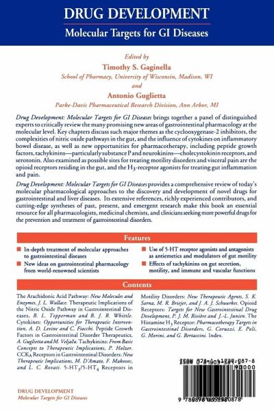 The application of molecular techniques to gastroenterology continues to yield important advances in the development of drugs to treat gastrointestinal disorders. Important new drugs have emerged through the collaborative and complementary efforts of basic scientists, clinicians, and clinical researchers in academia and the pharmaceutical industry. The challenge has been exciting, with a few surprises along the way. Consider peptic ulcer disease as an example. The discovery of H receptors and the availability of potent and 2 selective H-receptor antagonists signaled the beginning of a new era 2 in the treatment of gastric hypersecretory states and peptic ulcers. Introduction of proton pump inhibitors offered another therapeutic option. Though H-receptor antagonists and proton pump inhibitors 2 are important and useful drugs, the discovery of the link between H. pylori infection and peptic ulcer disease has led to even more effective pharmacotherapeutic regimens. Our intent in Drug Development: Molecular Targets for GI Diseases is to bring together hands-on experts to review promising areas of gastrointestinal pharmacology. The contemporary topics covered, from a mechanistic viewpoint, are relevant to gastrointestinal inflammation and motility disorders. Authoritative opinions are offered on both future research directions and potential applications for new therapies.