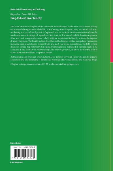 Overview of Mechanisms of Drug-Induced Liver Injury (DILI) and Key Challenges in DILI Research.- Detection, Elimination, Mitigation, and Prediction of Drug-Induced Liver Injury in Drug Discovery.- Drug-Induced Liver Injury (DILI) Classification and Its Application on Human DILI Risk Prediction.- Physicochemical Properties and Structural Alerts.- Quantitative Structure-Activity Relationship Models for Predicting Risk of Drug-Induced Liver Injury in Humans.- An Introduction to DILIsym® Software, a Mechanistic Mathematical Representation of Drug-Induced Liver Injury.- Prediction of Human Liver Toxicity Using In Vitro Assays: Limitations and Opportunities.- Use of Liver-Derived Cell Lines for the Study of Drug-Induced Liver Injury.- Evaluation of Drug-induced Liver Injuries (DILI) with Human Hepatocytes: Scientific Rationale and Experimental Approaches.- Status and Use of Induced Pluripotent Stem Cells (iPSCs) in Toxicity Testing.- Engineered Human Liver Co-Culturesfor Investigating Drug-Induced Liver Injury.- Status and Future of 3D Cell Culture in Toxicity Testing.- Reactive Metabolite Assessment in Drug Discovery and Development in Support of Safe Drug Design.- In Vitro Assessment of Mitochondrial Toxicity to Predict Drug-Induced Liver Injury.- Bile Salt Export Pump: Drug-Induced Liver Injury and Assessment Approaches.- High Content Screening for Prediction of Human Drug-Induced Liver Injury.- Interpretation, Integration, and Implementation of In Vitro Assay Data: The Predictive Toxicity Challenge.- Perspectives on the Regulatory and Clinical Science of Drug-Induced Liver Injury (DILI).- Regulatory Toxicological Studies: Identifying Drug-Induced Liver Injury Using Nonclinical Studies.- Hy's Law and eDISH for Clinical Studies.- Variability in Baseline Liver Test Values in Clinical Trials: Challenges in Enhancing Drug-Induced Liver Injury Assessment in Subjects with Liver Disease.- Postmarketing Surveillance of Drug-Induced Liver Injury.- HostRisk Modifiers in Idiosyncratic Drug-Induced Liver Injury (DILI) and Its Interplay with Drug Properties.- Human Leukocyte Antigen (HLA) and Other Genetic Risk Factors in Drug-Induced Liver Injury (DILI).- Immune Mechanisms in Drug-Induced Liver Injury.- Translational and Mechanistic Biomarkers of Drug-Induced Liver Injury.- Causality Assessment Methods in Drug-Induced Liver Injury.- Circulating MicroRNAs as Novel Biomarkers of Drug-Induced Liver Injury in Humans.- Systems Microscopy Approaches in Unraveling and Predicting Drug-Induced Liver Injury (DILI).- Non-Invasive Pre-Clinical and Clinical Imaging of Liver Transporter Function Relevant to Drug-Induced Liver Injury.