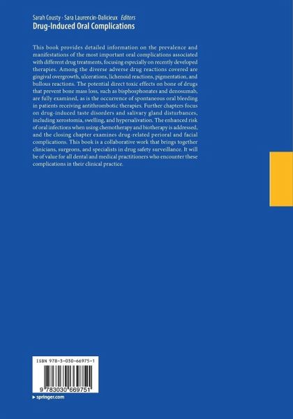This book provides detailed information on the prevalence and manifestations of the most important oral complications associated with different drug treatments, focusing especially on recently developed therapies. Among the diverse adverse drug reactions covered are gingival overgrowth, ulcerations, lichenoid reactions, pigmentation, and bullous reactions. The potential direct toxic effects on bone of drugs that prevent bone mass loss, such as bisphosphonates and denosumab, are fully examined, as is the occurrence of spontaneous oral bleeding in patients receiving antithrombotic therapies. Further chapters focus on drug-induced taste disorders and salivary gland disturbances, including xerostomia, swelling, and hypersalivation. The enhanced risk of oral infections when using chemotherapy and biotherapy is addressed, and the closing chapter examines drug-related perioral and facial complications. This book is a collaborative work that brings together clinicians, surgeons, and specialists in drug safety surveillance. It will be of value for all dental and medical practitioners who encounter these complications in their clinical practice.
