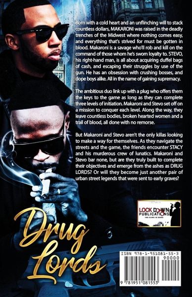 Born with a cold heart and an unflinching will to stack countless dollars, MAKARONI was raised in the deadly trenches of the Midwest where nothing comes easy, and everything that's strived for must be gotten in blood. Makaroni is a savage who'll rob and kill on the command of those whom he's sworn loyalty to. STEVO, his right-hand man, is all about acquiring duffel bags of cash, and escaping their struggles by use of the gun. He has an obsession with crushing bosses, and dope boys alike. All in the name of gaining supremacy. The ambitious duo link up with a plug who offers them the keys to the game as long as they can complete three levels of initiation. Makaroni and Stevo set off on a mission to conquer each level. Along the way, they leave countless bodies, broken hearted women and a trail of blood, all done with no remorse. But Makaroni and Stevo aren't the only killas looking to make a way for themselves. As they navigate the streets and the game, the friends encounter STACY and his murderous crew of lunatics. Makaroni and Stevo bar none, but are they truly built to complete their objectives and emerge from the ashes as DRUG LORDS? Or will they become just another pair of urban street legends that were sent to early graves?