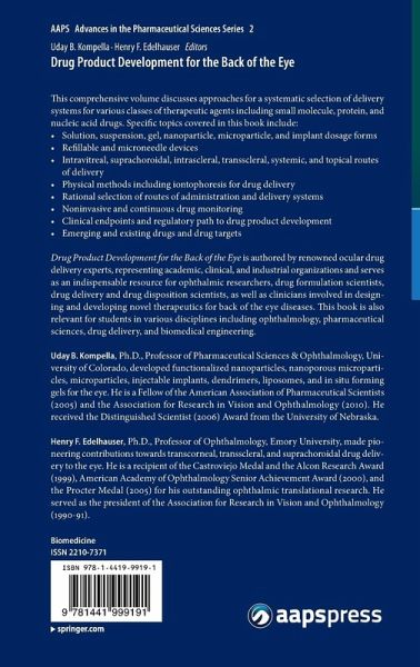 Drug Product Development for the Back of the Eye is authored by renowned ocular drug delivery experts, representing academic, clinical, and industrial organizations and serndustrial organizations and serves as indispensable resource for ophthalmic researchers, drug formulation scientists, drug delivery and drug disposition scientists, as well as clinicians involved in designing and developing novel therapeutics for the back of theeye diseases. This book is also relevant for students in various disciplines including ophthalmology, pharmaceutical sciences, drug delivery, and biomedical engineering.