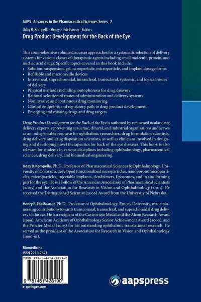 Drug Product Development for the Back of the Eye is authored by renowned ocular drug delivery experts, representing academic, clinical, and industrial organizations and serndustrial organizations and serves as indispensable resource for ophthalmic researchers, drug formulation scientists, drug delivery and drug disposition scientists, as well as clinicians involved in designing and developing novel therapeutics for the back of theeye diseases. This book is also relevant for students in various disciplines including ophthalmology, pharmaceutical sciences, drug delivery, and biomedical engineering.