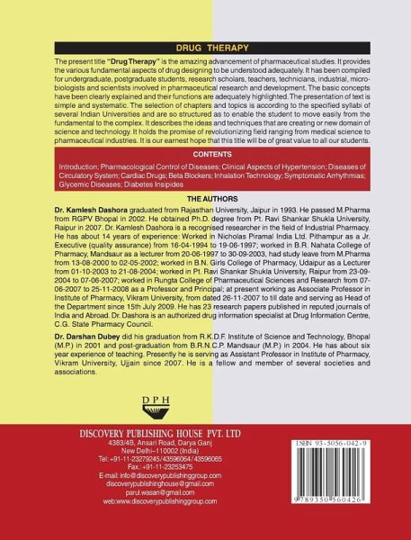 The present title "Drug Therapy" is the amazing advancement of pharmaceutical studies. It provides the various fundamental aspects of drug designing to be understood adequately. It has been compiled for undergraduate, postgraduate students, research scholars, teachers, technicians, industrial, microbiologists and scientists involved in pharmaceutical research and development. The basic concepts have been clearly explained and their functions are adequately highlighted. The presentation of text is simple and systematic. The selection of chapters and topics is according to the specified syllabi of several Indian Universities and are so structured as to enable the student to move easily from the fundamental to the complex.