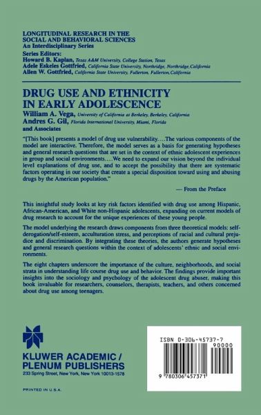 This book presents new and important information about adolescent drug use. The book is intended for human service professionals, teachers, researchers, and students interested in the issue of early adolescent drug use and its causes and pervasiveness in a multiethnic population. Today, the field of adolescent drug use research relies on integrative models that permit competing explanations of drug use. This approach promotes flexibility in testing hypotheses pertinent to adol- cents of very different social and cultural backgrounds or personal characteristics. Longitudinal studies, including the one presented in these pages, have identified many risk and protective factors or processes that are linked to adolescent drug use. We review these throughout this book and present new information from our own research. Our point of departure is to extend and elaborate descriptive research and models of adolescent drug research to cover the unique and diverse experiences of adolescents who are Hispanic, African American, and White non-Hispanic.
