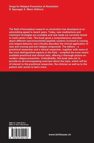 Alcoholism is a pathological behavioural syndrome, characterised by comp- sive alcohol use, craving and relapses, even recurring after many years of abstinence. It is suggested that chronic alcohol abuse leads to persistent changes within several neurochemical pathways in the brain and furthermore that an imprinted drug and addiction memory may scarcely be extinguished. Hence, the question arises as to whether there ought to be a reasonable hope that pharmacological drugs will be developed that interfere with an addiction memory, and as a result, finally lead to a cure? In this book, leading preclinical and clinical experts in the field of alcohol relapse prevention strive to furnish an answer to this question. None of the researchers or clinicians believes in a magic bullet that will be of help to all alcoholic patients in overcoming this disease. However, there is now convi- ing evidence demonstrating that specific subpopulations of alcoholic patients experience satisfactory benefit from currently available treatments. Today we have two medications for relapse prevention on the market - acamprosate and naltrexone. Although, currently, only a minority of alcoholic patients benefit from these medications, the approval of these compounds may be considered a hallmark in the field of psychopharmacology, even comparable to the era when the first antidepressant compounds were introduced. In recent years we have been witnessing an enormous growth in the science and knowledge regarding the field of relapse prevention.