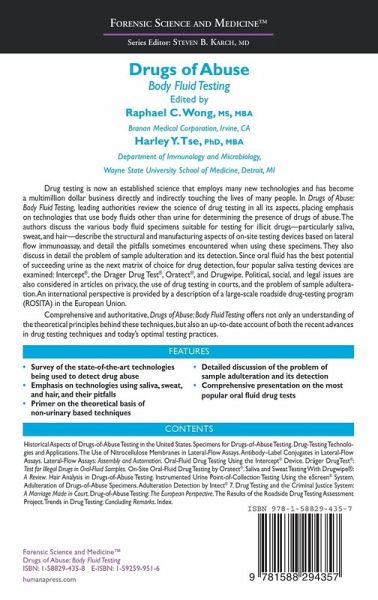 A comprehensive review of the science of drug testing in all its aspects, placing emphasis on technologies that use body fluids other than urine for determining the presence of drugs of abuse. The authors discuss the various body fluid specimens suitable for testing for illicit drugs-particularly saliva, sweat, and hair-describe the structural and manufacturing aspects of on-site testing devices based on lateral flow immunoassay, and detail the pitfalls of using these specimens. They also discuss in detail the problem of sample adulteration and its detection. Since oral fluid has the best potential of succeeding urine as the next matrix of choice for drug detection, four popular saliva testing devices are examined: Intercept®, the Drager Drug Test®, Oratect®, and Drugwipe. Political, social, and legal issues are also considered in articles on privacy, the use of drug testing in courts, and the problem of sample adulteration. Drug testing is now an established science that employsmany new technologies and has become a multimillion dollar business directly and indirectly touching the lives of many people. In Drugs of Abuse: Body Fluid Testing, leading authorities review the science of drug testing in all its aspects, placing emphasis on technologies that use body fluids other than urine for determining the presence of drugs of abuse. The authors discuss the various body fluid specimens suitable for testing for illicit drugs-particularly saliva, sweat, and hair-describe the structural and manufacturing aspects of on-site testing devices based on lateral flow immunoassay, and detail the pitfalls sometimes encountered when using these specimens. They also discuss in detail the problem of sample adulteration and its detection. Since oral fluid has the best potential of succeeding urine as the next matrix of choice for drug detection, four popular saliva testing devices are examined: Intercept®, the Drager Drug Test®, Oratect®, and Drugwipe. Political, social, and legal issues are also considered in articles on privacy, the use of drug testing in courts, and the problem of sample adulteration. An international perspective is provided by a description of a large-scale roadside drug-testing program (ROSITA) in the European Union.