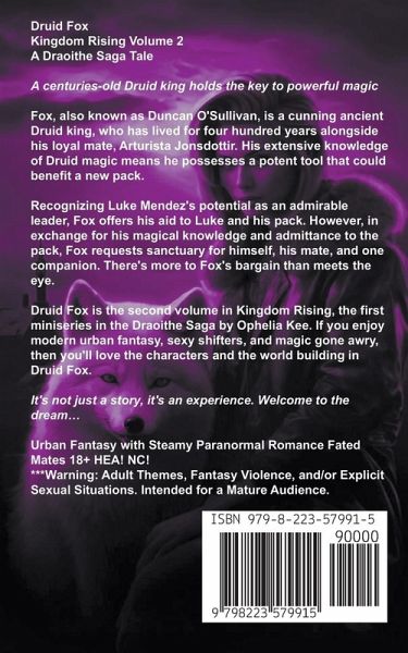 Druid Fox Kingdom Rising Volume 2 A Draoithe Saga Tale A centuries-old Druid king holds the key to powerful magic Fox, also known as Duncan O'Sullivan, is a cunning ancient Druid king, who has lived for four hundred years alongside his loyal mate, Arturista Jonsdottir. His extensive knowledge of Druid magic means he possesses a potent tool that could benefit a new pack. Recognizing Luke Mendez's potential as an admirable leader, Fox offers his aid to Luke and his pack. However, in exchange for his magical knowledge and admittance to the pack, Fox requests sanctuary for himself, his mate, and one companion. There's more to Fox's bargain than meets the eye. Fox harbors a few secrets which could pose a significant risk to the pack, and Luke must decide whether the offered deal is worth jeopardizing his group's safety. Above all, the fate of Fox's cherished mate is at stake. It remains to be seen whether a lone fox will ultimately join forces with the pack. Druid Fox is the second volume in Kingdom Rising, the first miniseries in the Draoithe Saga by Ophelia Kee. If you enjoy modern urban fantasy, sexy shifters, and magic gone awry, then you'll love the characters and the world building in Druid Fox. It's not just a story, it's an experience. Welcome to the dream... Urban Fantasy with Steamy Paranormal Romance Fated Mates 18+ HEA! NC! ***Warning: Adult Themes, Fantasy Violence, and/or Explicit Sexual Situations. Intended for a Mature Audience.