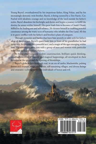 Young Baytel, overshadowed by his imperious father, King Vokat, and by his increasingly demonic twin brother, Ravek, is being tutored by a Tree Faerie, Cyr. Fueled with idealistic courage and no knowledge of the land outside his father's realm, Baytel abandons his birthright and duties and begins a journey to fulfill the destiny he senses within himself. His quest leads him to become a Citadel Druid, skilled in the healing arts and self-reliance. He devotes himself to enabling peaceful coexistence among the many sects of humanity who inhabit the One Land. All this is in grave conflict with his father's and brother's plans of conquest. Through mysteries and battles that leave him severely at odds with his father's ideas of domination, Baytel's quest leads him to learn of his grandfather he had never met, his ancestry in a powerful sect, and a magic of the ages emerging within him. His adventures unite him with a group of men and women with particular individual skills and resourcefulness. To bring peace requires violent counteraction, brilliant quick thinking, steadfastness, a bit of humor, and magical happenings, all enveloped in their devotion to the quest and the ripening of friendships. Baytel's globe is breathtakingly real, in an era of castles, blacksmiths, pulsing forests and swamps, magic and spirits, self-sustaining villages, and diverse beings and creatures--a living earth with individuals of honor and evil.