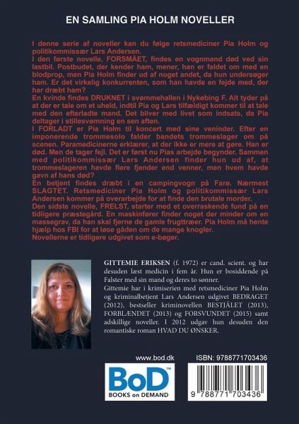 I denne serie af noveller kan du følge retsmediciner Pia Holm og politikommissær Lars Andersen. I den første novelle, FORSMÅET, findes en vognmand død ved sin lastbil. Postbudet, der kender ham, mener han er faldet om med en blodprop, men Pia Holm finder ud af noget andet, da hun undersøger ham. Er det virkelig konkurrenten, som han havde en fejde med, der har dræbt ham? En kvinde findes DRUKNET i svømmehallen i Nykøbing F. Alt tyder på at der er tale om et uheld, indtil Pia og Lars tilfældigt kommer til at tale med den efterladte mand. Det bliver med livet som indsats, da Pia deltager i stillesvømning en sen aften. I FORLADT er Pia Holm til koncert med sine veninder. Efter en imponerende trommesolo falder bandets trommeslager om på scenen. Paramedicinerne erklærer, at der ikke er mere at gøre. Han er død. Men de tager fejl. Det er først nu Pias arbejde begynder. Sammen med politikommissær Lars Andersen finder hun ud af, at trommeslageren havde flere fjender end venner, men hvem havde gavn af hans død? En betjent findes dræbt i en campingvogn på Farø. Nærmest SLAGTET. Retsmediciner Pia Holm og politikommissær Lars Andersen kommer på overarbejde for at finde den brutale morder. Den sidste novelle, FRELST, starter med et overraskende fund på en tidligere præstegård. En maskinfører finder noget der minder om en massegrav, da han skal fjerne de gamle frugttræer. Pia Holm må hente hjælp hos FBI for at løse gåden om de mange knogler. Novellerne er tidligere udgivet som selvstændige e-bøger. Dette er 2. novellesamling med Pia Holm.