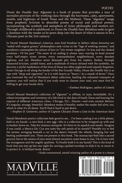 Drum the Double Sun-Algoems is a book of poems that provides a tour of surrealist portraits of the working-class through the barrooms, cafes, apartments, motels, and highways of South Texas and the Midwest. These "algoems" range from prophetic lyricism to absurdist poems of social and political protest, incorporating the symbols and metaphors of Aztec philosophy and western art. Through childhood to adulthood, Daniel Manuel Mendoza seeks to gain a closeness with the reader as he peers deep into the heart of what it means to be a Chicano poet in the 21st century.