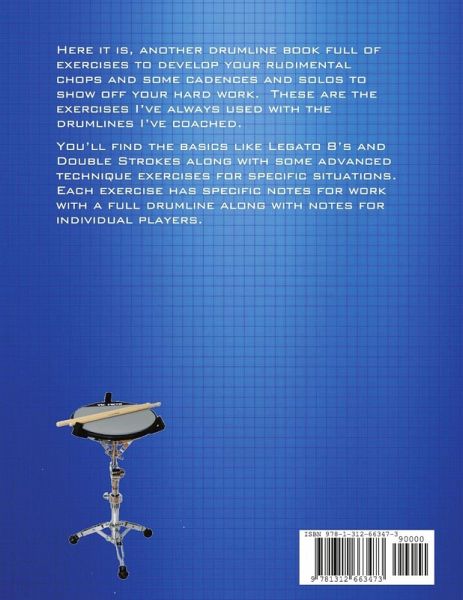¿Here it is, another drumline book full of exercises to develop your rudimental chops and some cadences and solos to show off your hard work. These are the exercises I've always used with the drumlines I've coached. You'll find the basics like Legato 8's and Double Strokes along with some advanced technique exercises for specific situations. Each exercise has specific notes for work with a full drumline along with notes for individual players.