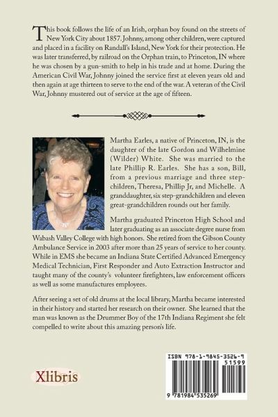 This book follows the life of an Irish, orphan boy found on the streets of New York City about 1857. Johnny, among other children, were captured and placed in a facility on Randalls Island, New York for their protection. He was later transferred, by railroad on the Orphan train, to Princeton, IN where he was chosen by a gun-smith to help in his trade and at home. During the American Civil War, Johnny joined the service first at eleven years old and then again at age thirteen to serve to the end of the war. A veteran of the Civil War, Johnny mustered out of service at the age of fifteen.