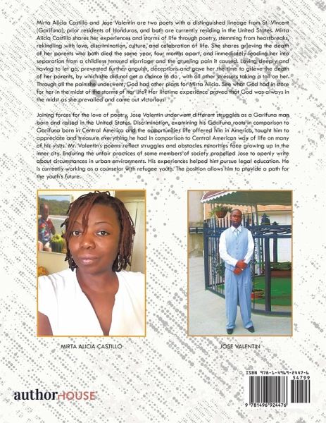 Mirta Alicia Castillo and Jose Valentin are two poets with a distinguished lineage from St. Vincent (Garifuna), prior residents of Honduras, and both are currently residing in the United States. Mirta Alicia Castillo shares her experiences and storms of life through poetry, stemming from heartbreaks, rekindling with love, discrimination, culture, and celebration of life. She shares grieving the death of her parents who both died the same year, four months apart, and immediately leading her into separation from a childless tenured marriage and the grueling pain it caused. Loving deeply and having to let go, prevented further anguish, deceptions and gave her the time to grieve the death of her parents, by which she did not get a chance to do , with all other stressors taking a toll on her. Through all the pain she underwent, God had other plans for Mirta Alicia. See what God had in store for her in the midst of the storms of her life? Her lifetime experience proved that God was always in the midst as she prevailed and came out victorious! Joining forces for the love of poetry, Jose Valentin underwent different struggles as a Garifuna man born and raised in the United States. Discrimination, examining his Garifuna roots in comparison to Garifuna born in Central America and the opportunities life offered him in America, taught him to appreciate and treasure everything he had in comparison to Central American way of life on many of his visits. Mr. Valentin's poems reflect struggles and obstacles minorities face growing up in the inner city. Enduring the unfair practices of some members of society propelled Jose to openly write about circumstances in urban environments. His experiences helped him pursue legal education. He is currently working as a counselor with refugee youth. The position allows him to provide a path for the youth's future.