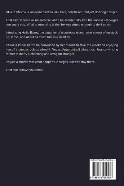 Oliver Osborne is known to most as impulsive, nonchalant, and just downright stupid. That said, it came as no surprise when he accidentally tied the knot in Las Vegas two years ago. What is surprising is that he was stupid enough to do it again. Introducing Hallie Evans; the daughter of a business tycoon who is most often stuck up, tense, and about as much fun as a dead fly. It took a lot for her to be convinced by her friends to take the weekend enjoying herself around a roulette wheel in Vegas. Apparently, it takes much less convincing for her to marry a charming and arrogant stranger. It's just a shame that what happens in Vegas, doesn't stay there. That shit follows you home.