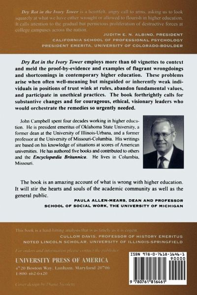 While many books have criticized higher education for an apparent bias towards leftist agendas, John R. Campbell takes a different approach. Through the compilation of 65 vignettes that peek behind the boardroom door, the author focuses on the bureaucratic and organizational stagnation that has led to "dry rot" in the ivory towers of academia. Dry Rot in the Ivory Tower presents substantive evidence of the problems that exist in universities today, and provides the author's prognosis for change. He addresses nepotism, ineffective faculty, lack of effective leadership, and other serious problems at our institutions of higher education.
