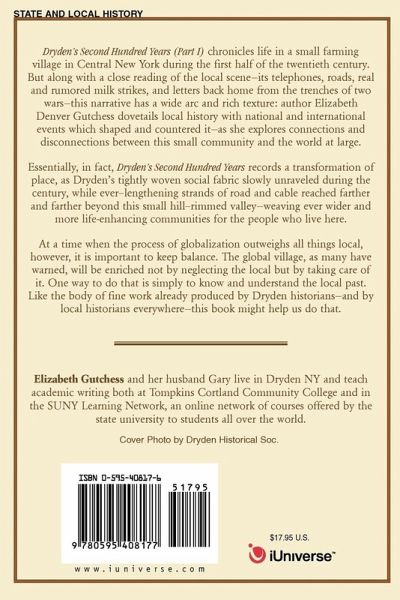 Dryden's Second Hundred Years (Part I) chronicles life in a small farming village in Central New York during the first half of the twentieth century. But along with a close reading of the local scene-its telephones, roads, real and rumored milk strikes, and letters back home from the trenches of two wars-this narrative has a wide arc and rich texture: author Elizabeth Denver Gutchess dovetails local history with national and international events which shaped and countered it-as she explores connections and disconnections between this small community and the world at large. Essentially, in fact, Dryden's Second Hundred Years records a transformation of place, as Dryden's tightly woven social fabric slowly unraveled during the century, while ever-lengthening strands of road and cable reached farther and farther beyond this small hill-rimmed valley-weaving ever wider and more life-enhancing communities for the people who live here. At a time when the process of globalization outweighs all things local, however, it is important to keep balance. The global village, as many have warned, will be enriched not by neglecting the local but by taking care of it. One way to do that is simply to know and understand the local past. Like the body of fine work already produced by Dryden historians-and by local historians everywhere-this book might help us do that.