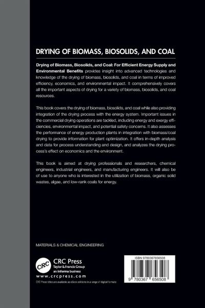 Drying of Biomass, Biosolids, and Coal: For Efficient Energy Supply and Environmental Benefits provides insight into advanced technologies and knowledge of the drying of biomass, biosolids, and coal in terms of improved efficiency, economics, and environmental impact. It comprehensively covers all the important aspects of drying for a variety of biomass, biosolids and coal resources. This book covers the drying of biomass, bio-solids and coal while also providing integration of the drying process with the energy system. Important issues in the commercial drying operations are tackled, including energy and exergy efficiencies, environmental impact, and potential safety concerns. It also assesses the performance of energy production plants in integration with biomass/coal drying to provide information for plant optimization. It offers in-depth analysis and data for process understanding and design, and analyzes the drying process's effect on economics and the environment. This book is aimed at drying professionals and researchers, chemical engineers, industrial engineers, and manufacturing engineers. It will also be of use to anyone who is interested in the utilization of biomass, organic solid wastes, algae and low-rank coals for energy.