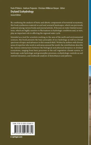 Chapter 1. Introduction.- SECTION 1: FUNDAMENTAL PROCESSES AND INTERACTIONS IN THE SOIL-CLIMATE-VEGETATION SYSTEM.- Chapter 2. Soil Moisture Dynamics in Water-Limited Ecosystems.- Chapter3. Soil physical properties and associated soil-root interactions.- Chapter 4. Ecophysiology of plants in dry environments.- Chapter 5. Ecohydrology of Photosynthesis.- Chapter 6. Ecohydrological controls on the deposition of non-rainfall water, N and P to dryland ecosystems.- Interactions and feedbacks between climate and dryland vegetations.- SECTION 2: HYDROGEOMORPHOLOGY AND LANDFORMS OF ARID AND SEMIARID LANDSCAPES.- Chapter 8. The history and evolution of desert hydrology and landforms: The role of climate change.- Chapter 9. Ecohydrological implications of aeolian processes in drylands.- Chapter 10. Hydrological and geomorphological significance of riparian vegetation in drylands.- SECTION 3: ECOHYDROLOGIC CONTROLS on NUTRIENT CYCLING and DISTURBANCES.- Chapter 11. Ecohydrological and stoichiometric controls on soil carbon and nitrogen dynamics in drylands.- Chapter 12. Modeling of Phosphorus Dynamics in Dryland Ecosystems.- Chapter 13. Microbial nitric oxide, nitrous oxide and nitrous acid emissions from drylands.- Chapter 14. Fire regimes in dryland landscapes.- Chapter 15. Termites as mediators of the water economy of arid savanna ecosystems.- SECTION 4: ECOHYDROLOGY OF A VARIETY OF DRYLAND ECOSYSTEMS.- Chapter 16. Interactions of water and nitrogen on primary productivity across spatial and temporal scales in grassland and shrubland ecosystems.- Chapter 17. Deforestation, water availability, and nutrient cycling in dry forests.- Chapter 18. Vegetation pattern formation in drylands.- Chapter 19. Ecohydrology of agroecosystems - Interactions between local and global processes.- Chapter 20. Ecohydrology of urban ecosystems.- Chapter 21. Desertification and land degradation.