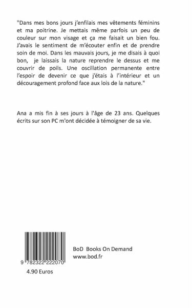 Ana a mis fin à ses jours à l'âge de 23 ans. Quelques écrits sur son PC m'ont décidée à écrire un témoignage de sa vie.