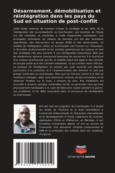 Cette étude examine de manière critique la stratégie et les défis de la réintégration des ex-combattants au Sud-Soudan. Les données de l'étude ont été collectées et analysées à l'aide d'approches qualitatives. Les principales techniques de collecte de données ont été des entretiens approfondis, des discussions de groupe (FGD) et des observations. Le modèle de réintégration utilisé au Sud-Soudan met l'accent sur l'éducation, la formation professionnelle et les activités génératrices de revenus en tant que stratégies clés pour parvenir à une réintégration économique. Bien que de nombreuses agences consacrent beaucoup de ressources à la fourniture d'un soutien psychosocial aux XC, le modèle utilisé fait appel à des conseils de groupe plutôt qu'à des conseils individuels, ce qui semble moins efficace. La politique de réintégration ne semble pas avoir accordé une attention particulière à la protection et à l'autonomisation des femmes en tant que groupe vulnérable au Sud-Soudan. Bien que les femmes soient à la tête de nombreux ménages, elles sont néanmoins victimes de discriminations et de violences fondées sur le sexe, y compris de viols. Peu d'attention est accordée à d'autres groupes vulnérables de XC, en particulier ceux qui sont physiquement handicapés à la suite de blessures subies pendant la guerre. Les problèmes et les défis rencontrés dans le processus de réintégration au Sud-Soudan