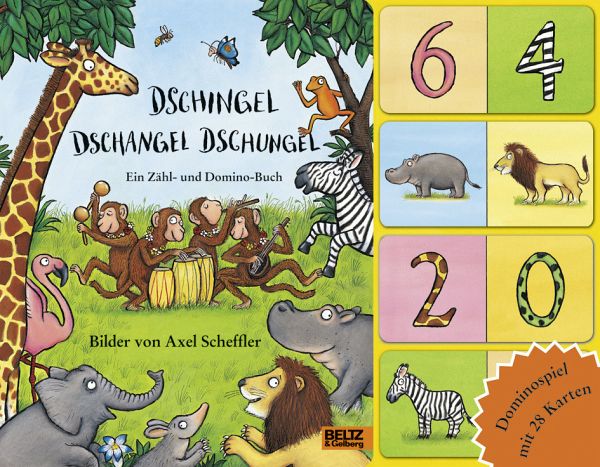 Eine kleine Geschichte mit Versen, Tiere zum Zählen und viele Dominokarten mit Zahlen ud Bildern - das ist das Dschingel-Dschangel-Dschungel-Buch von Axel Scheffler, dem Illustrator des Grüffelo: 1 Nilpferd, 2 Giraffen, 3 Elefanten, 4 Zebras, 5 Löwen, 6 Flamingos, 7 Erdferkel, 8 Schmetterlinge, 9 Bienen und 10 Frösche, die alle beim Dschingel Dschangel Dschungel-Fest zum Tanzen kommen.