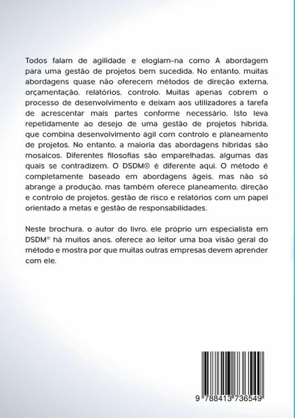 Todos falam de agilidade e elogiam-na como A abordagem para uma gestão de projetos bem sucedida. No entanto, muitas abordagens quase não oferecem métodos de direção externa, orçamentação, relatórios, controlo. Muitas apenas cobrem o processo de desenvolvimento e deixam aos utilizadores a tarefa de acrescentar mais partes conforme necessário. Isto leva repetidamente ao desejo de uma gestão de projetos híbrida, que combina desenvolvimento ágil com controlo e planeamento de projetos. No entanto, a maioria das abordagens híbridas são mosaicos. Diferentes filosofias são emparelhadas, algumas das quais se contradizem. O DSDM® é diferente aqui. O método é completamente baseado em abordagens ágeis, mas não só abrange a produção, mas também oferece planeamento, direção e controlo de projetos, gestão de risco e relatórios com um papel orientado a metas e gestão de responsabilidades. Neste brochura, o autor do livro, ele próprio um especialista em DSDM® há muitos anos, oferece ao leitor uma boa visão geral do método e mostra por que muitas outras empresas devem aprender com ele.