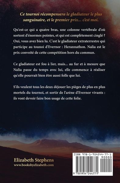 Ce tournoi récompensera le gladiateur le plus sanguinaire, et le premier prix... c'est moi. Qu'est-ce qui a quatre bras, une colonne vertébrale d'où sortent d'énormes pointes, et qui est complètement cinglé ? Oui, vous avez bien lu. C'est le gladiateur extraterrestre qui participe au tounoi d'Evernor : Herannathon. Nalia est le prix convoité de cette compétition hors du commun. Ce gladiateur est fou à lier, mais... au fur et à mesure que Nalia passe du temps avec lui, elle commence à réaliser qu'elle pourrait bien être aussi folle que lui. S'ils veulent tous les deux déjouer les pièges de plus en plus mortels du tournoi, et sortir de l'arène d'Evernor vivants : ils vont devoir faire bon usage de cette folie. _____ Désirée par le Gladiateur d'Evernor est le huitième livre de la Passion Xiveri, une romance extraterrestre de science-fiction. Tous les livres font la part belle à la mixité et les mondes présentés sont tous différents. En outre, les intrigues amoureuses, passionnées, destinées à un public adulte, ont toutes une fin heureuse. #PassionXiveri #ElizabethStephens #romanceextraterrestre #livrefantasy