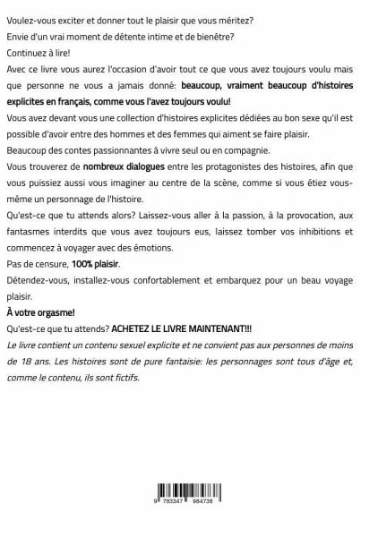 Voulez-vous exciter et donner tout le plaisir que vous méritez?Envie d'un vrai moment de détente intime et de bienêtre?Continuez à lire!Avec ce livre vous aurez l'occasion d'avoir tout ce que vous avez toujours voulu mais que personne ne vous a jamais donné: beaucoup, vraiment beaucoup d'histoires explicites en français, comme vous l'avez toujours voulu!Vous avez devant vous une collection d'histoires explicites dédiées au bon sexe qu'il est possible d'avoir entre des hommes et des femmes qui aiment se faire plaisir. Beaucoup des contes passionnantes à vivre seul ou en compagnie.Vous trouverez de nombreux dialogues entre les protagonistes des histoires, afin que vous puissiez aussi vous imaginer au centre de la scène, comme si vous étiez vous-même un personnage de l'histoire.Qu'est-ce que tu attends alors? Laissez-vous aller à la passion, à la provocation, aux fantasmes interdits que vous avez toujours eus, laissez tomber vos inhibitions et commencez à voyager avec des émotions.Pas de censure, 100 pour 100 de plaisir.Détendez-vous, installez-vous confortablement et embarquez pour un beau voyage plaisir.À votre orgasme!