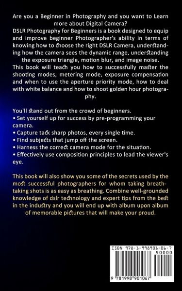 Are you a Beginner in Photography and you want to Learn more about Digital Camera? DSLR Photography for Beginners is a book designed to equip and improve beginner Photographer's ability in terms of knowing how to choose the right DSLR Camera, understanding how the camera sees the dynamic range, understanding the exposure triangle, motion blur, and image noise. This book will teach you how to successfully master the shooting modes, metering mode, exposure compensation and when to use the aperture priority mode, how to deal with white balance and how to shoot golden hour photography. You'll stand out from the crowd of beginners.Set yourself up for success by pre-programming your camera. Capture tack sharp photos, every single time. Find subjects that jump off the screen. Harness the correct camera mode for the situation. Effectively use composition principles to lead the viewer's eye. This book will also show you some of the secrets used by the most successful photographers for whom taking breath-taking shots is as easy as breathing. Combine well-grounded knowledge of dslr technology and expert tips from the best in the industry and you will end up with album upon album of memorable pictures that will make your proud.