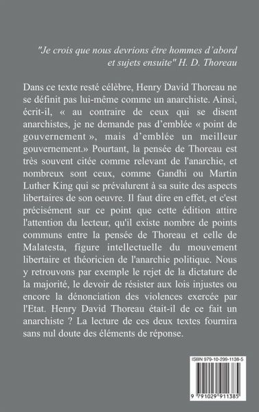 "Je crois que nous devrions être hommes d'abord et sujets ensuite" H. D. Thoreau Dans ce texte resté célèbre, Henry David Thoreau ne se définit pas lui-même comme un anarchiste. Ainsi, écrit-il, au contraire de ceux qui se disent anarchistes, je ne demande pas d'emblée point de gouvernement , mais d'emblée un meilleur gouvernement. Pourtant, la pensée de Thoreau est très souvent citée comme relevant de l'anarchie, et nombreux sont ceux, comme Gandhi ou Martin Luther King qui se prévalurent à sa suite des aspects libertaires de son oeuvre. Il faut dire en effet, et c'est précisément sur ce point que cette édition attire l'attention du lecteur, qu'il existe nombre de points communs entre la pensée de Thoreau et celle de Malatesta, figure intellectuelle du mouvement libertaire et théoricien de l'anarchie politique. Nous y retrouvons par exemple le rejet de la dictature de la majorité, le devoir de résister aux lois injustes ou encore la dénonciation des violences exercée par l'Etat. Henry David Thoreau était-il de ce fait un anarchiste ? La lecture de ces deux textes fournira sans nul doute des éléments de réponse.