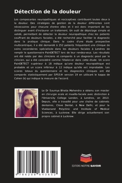 Les composantes neuropathiques et nociceptives contribuent toutes deux à la douleur. Des stratégies de gestion de la douleur différentes sont nécessaires pour chacune d'entre elles et il est donc important de les distinguer avant d'instaurer un traitement. Un outil de dépistage simple et validé, permettant de détecter la douleur neuropathique chez les patients souffrant de douleurs faciales, a été recherché pour faciliter le diagnostic dans la pratique clinique. Dans le cadre d'une étude prospective multicentrique, il a été demandé à 252 patients fréquentant une clinique de soins secondaires spécialisée dans les douleurs faciales à Londres de remplir le questionnaire PainDETECT lors de leur rendez-vous. Les résultats ont été notés par des cliniciens et comparés à un diagnostic posé par le clinicien, qui a été considéré comme l'étalon-or dans cette étude. Un score PainDETECT supérieur à 18 indique qu'une douleur neuropathique est probable et un score inférieur à 12 indique qu'elle est improbable. Les scores totaux du questionnaire et les diagnostics cliniques ont été comparés statistiquement par SPSS® version 19 en utilisant le kappa de Cohen (k) qui indique la mesure de l'accord.