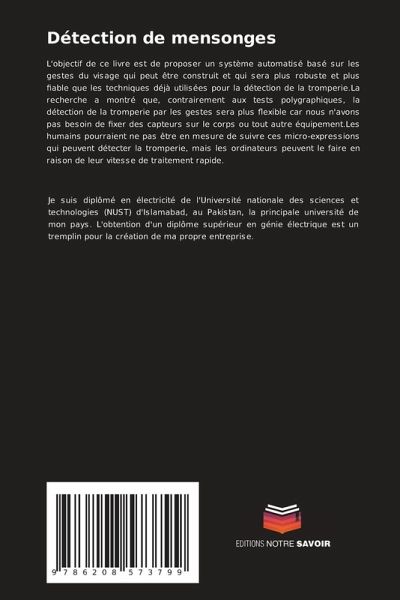L'objectif de ce livre est de proposer un système automatisé basé sur les gestes du visage qui peut être construit et qui sera plus robuste et plus fiable que les techniques déjà utilisées pour la détection de la tromperie.La recherche a montré que, contrairement aux tests polygraphiques, la détection de la tromperie par les gestes sera plus flexible car nous n'avons pas besoin de fixer des capteurs sur le corps ou tout autre équipement.Les humains pourraient ne pas être en mesure de suivre ces micro-expressions qui peuvent détecter la tromperie, mais les ordinateurs peuvent le faire en raison de leur vitesse de traitement rapide.